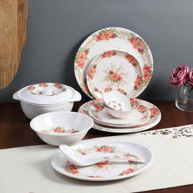 Enhance your dining accessories collection with this colourful and appealing Melamine White with Pink and Blue Rose Print Dinner Set in 33 pieces. It is made from the finest quality of melamine, which makes the dinnerware set durable and easy to maintain. Plus, this set is quite light in weight for your easy handling.